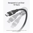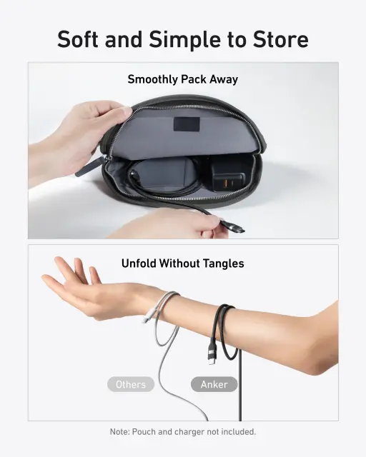 Pleten kabel, izdelan iz recikliranih materialov, je mehak na otip in odporen proti zapletanju. Za enostavno shranjevanje je priložen tudi silikonski organizator, ki pomaga ohraniti kabel urejen.