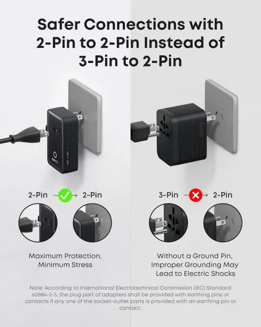 Adapter uporablja varno 2-pin → 2-pin konstrukcijo, ki zmanjšuje tveganje električnega udara in zagotavlja varnejšo uporabo v različnih državah.