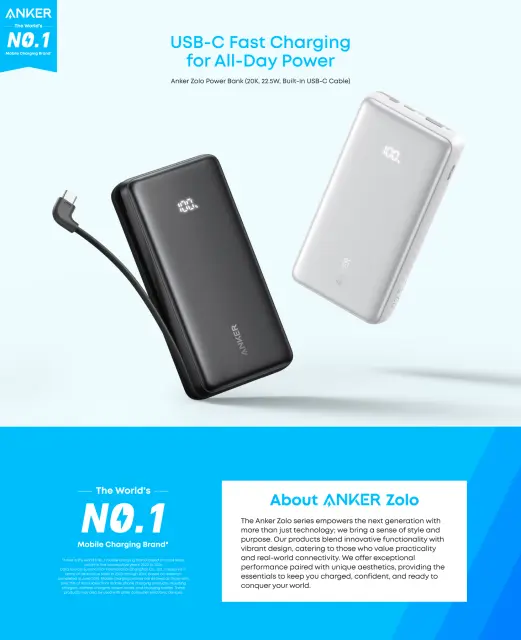 Anker Zolo Power Bank (20K, 22,5 W, z vgrajenim USB-C kablom) in navodila za uporabo.