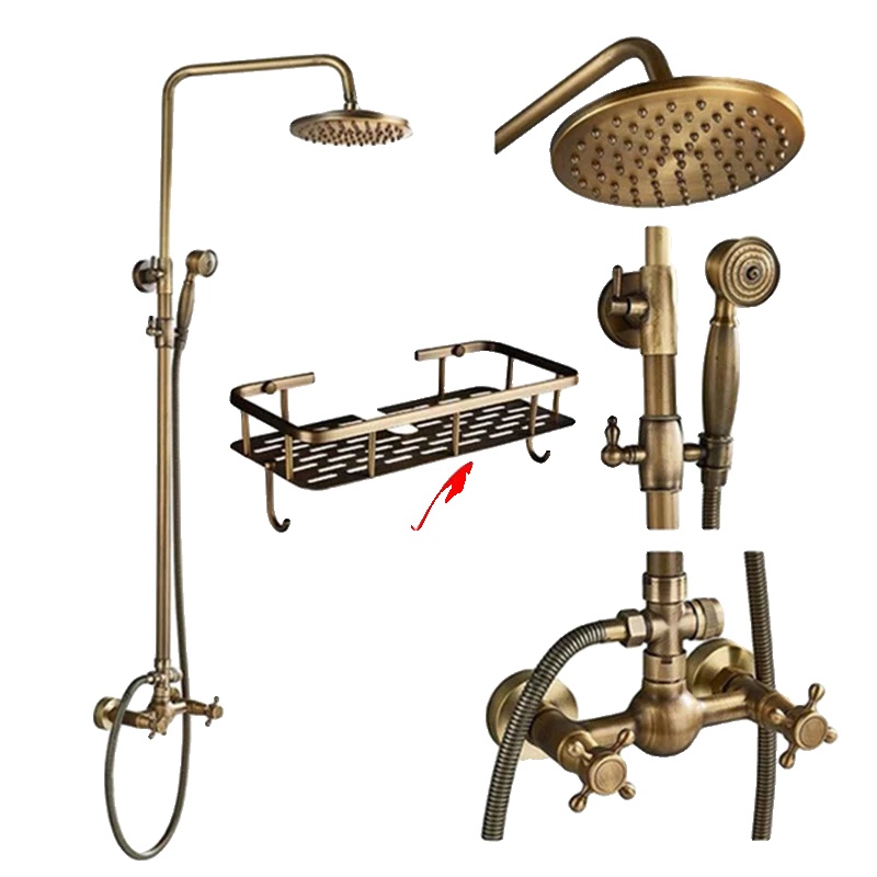 Antik medeninast tuš pipa, dvojna ročna kontrola, nastavljiva višina, A polica