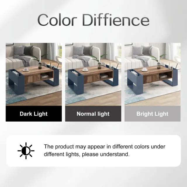 Antracitna klubska mizica z lesenimi vzorci, predalom brez ročajev in dvostranskim shranjevanjem.