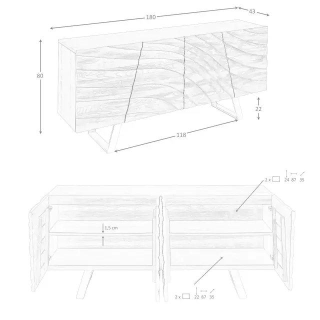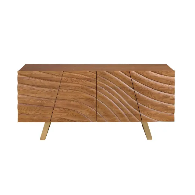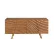 - Njegova vrata iz lesa v svetli orehovi barvi z dekorativnim reliefom dodajo vizualno globino in značaj ter spremenijo ta oblikovalski kredenc v ekskluziven in prefinjen kos.