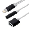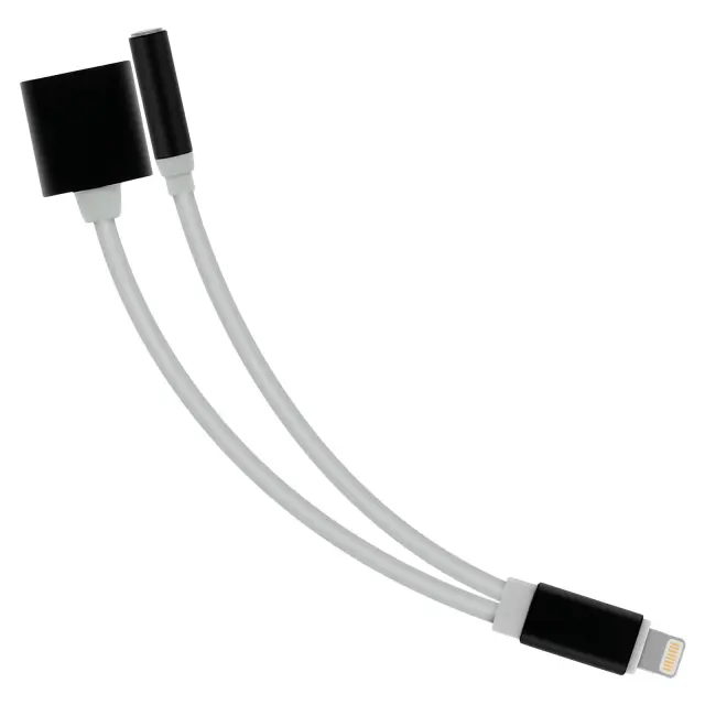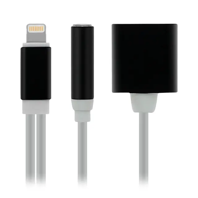 Avdio in polnilni adapter, združljiv z napravami, opremljenimi z vrati Lightning. Poslušajte glasbo in polnite svoj pametni telefon hkrati. Omogoča hitro in varno nalaganje vaše naprave. Ohranja nespremenjeno in optimalno kakovost zvoka.