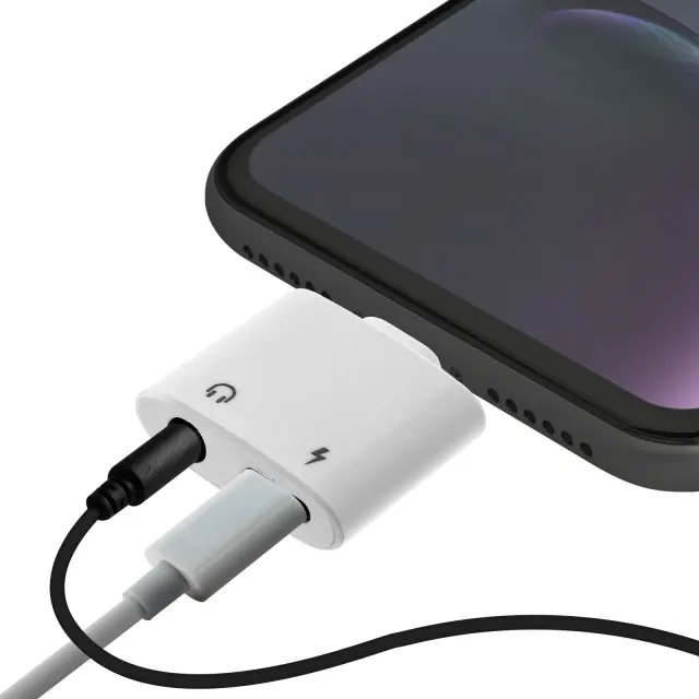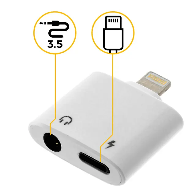 Ta adapter 2-v-1 vam omogoca hkratno polnjenje vaših naprav in poslušanje glasbe. Ima vrata Lightning in vticnico 3,5 mm Jack, ki vam omogocata, da hkrati prikljucite polnilni kabel in slušalke.
