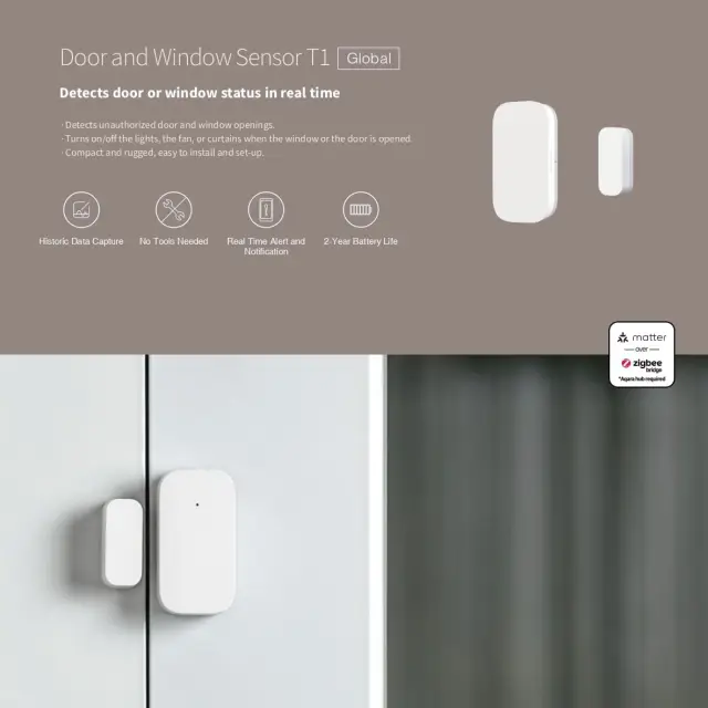 Napredna tehnologija: Aqara senzor za vrata in okna T1 zazna trenutno stanje vrat ali oken prek razdalje med senzorjem in magnetom. Senzor je tudi energetsko učinkovit in ena baterija lahko ob normalni uporabi zdrži več kot 2 leti.