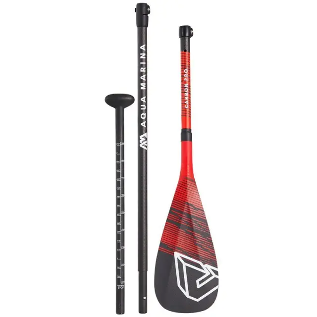 To vzdržljivo 3-delno karbonsko veslo je lahko kot peresce! Carbon Pro je trodelno sup veslo, primerno za že nekoliko izkušenejše suparje. Drog je izdelan iz kombinacije karbona in fiberglasa in ta kombinacija daje veslu lahkotnost, togost in trdnost. Da je teža celotnega vesla še nižja, je lopatka izdelana iz 100% karbona. Kot vsa vesla Aqua Marina, je tudi to trodelno in nastavljivo po višini (180 do 220 cm). Carbon Pro je izredno lahko, tehta le 750 g! Vse skrbi, da bo veslo potonilo, so odveč, saj bo veslo zahvaljujoč materialu samostojno plavalo na vodi. Ročaj v obliki črke T omogoča varen in udoben prijem. Drog podaljšate in ga fiksirate s sistemom dveh zaponk.
