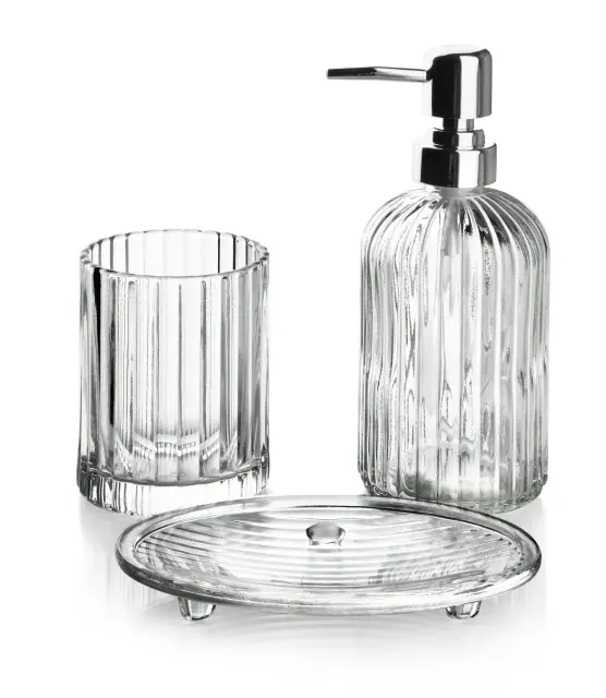 Predstavljamo vam elegantni 3-delni kopalniški set iz serije ARI blagovne znamke BATHLAB by MONDEX, ki bo obogati vaš kopalni prostor s pridihom sodobnega dizajna. Ta set je izdelan iz visoko kakovostnega stekla, kar zagotavlja trajnost in estetski videz, ki se lepo vklopi v različne stile notranje opreme. Vključuje posodo za milo, stekleno skodelico za zobne ščetke in dozirnik za milo s plastično črpalko, kar predstavlja idealno rešitev za organizacijo in dekoracijo vaše kopalnice.Dozirnik za milo ima dimenzije 7,8*7,8*h19 cm in prostornino 400 ml, kar omogoča enostavno uporabo in dolgotrajno shranjevanje vašega najljubšega milo. Steklena skodelica za zobne ščetke meri 7,7*7,7*h10 cm in je zasnovana za prostornino 300 ml, kar ponuja dovolj prostora za vse vaše zobne ščetke in druge potrebščine za osebno nego. Posoda za milo z dimenzijami 15,2*9,7*h2 cm je praktična in elegantna, se hitro čisti ter doda pridih sophistication v vaši kopalnici.Vse komponente kompleta so shranjene v privlačni beli škatli dimenzij 19x9xh19 cm, ki je odlična za zaščito in shranjevanje. Ta set ne le, da je izjemno funkcionalen, temveč tudi estetsko privlačen, kar ga naredi za odlično izbiro za vse, ki iščejo združitev kvalitete, funkcionalnosti in sodobnega dizajna. Z nakupom 3-delnega kopalniškega seta ARI boste investirali v slog in praktičnost, ki bosta postala nepogrešljiv del vaše vsakodnevne rutine.