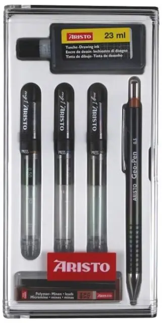 Aristo Set za tehnično risanje - 6-delni ponovno dobavljiv v januarju 6-delni set: 3x tehnično pisalo 0,25, 0,35, 0,5mm, tehnični svinčnik 0,5mm, mince za tehnični svinčnik, črnilo za tehnična pisala
