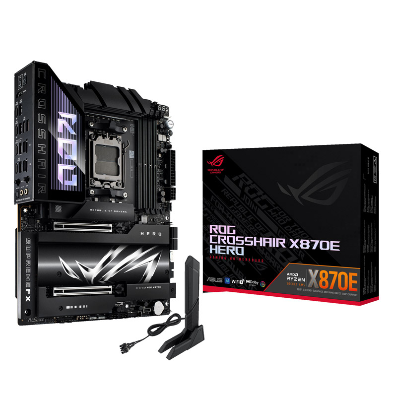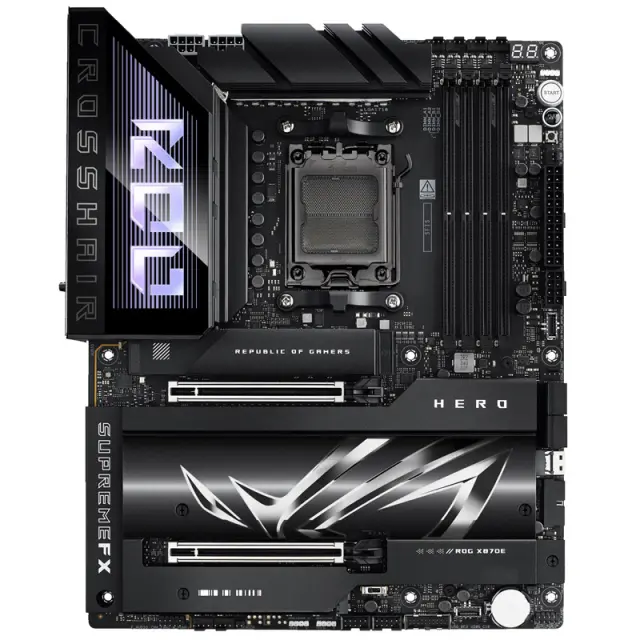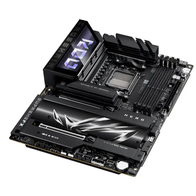 ROG Crosshair X870E Hero, pripravljen za AI PC, ponuja nepopustljivo napajanje, robustno toplotno upravljanje, izjemno hitro povezljivost ter celovito podporo za PCIe 5.0 in DDR5, kar omogoča polno zmogljivost procesorjev AMD Ryzen 9000 serije. Temni odtenki prevladujejo po celotni matični plošči, poudarjajo kovinske teksture, ponikljane površine, elegantne linije in stereoskopski vizualni učinek na velikem hladilniku za M.2 in vezni nabor. Plošča vključuje tudi učinek Polymo Lighting II - nadgrajen svetlobni modul v I/O pokrovu, ki zagotavlja dinamično RGB osvetlitev logotipa ROG.