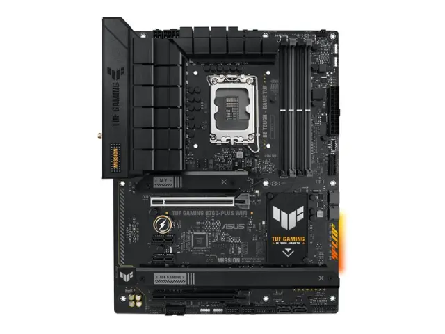 TUF GAMING B760-PLUS WIFI združuje bistvene funkcije procesorjev Intel z namensko igralno funkcionalnostjo in komponentami, ki so dokazale svojo vzdržljivost. Ta matična plošča, zasnovana s težkimi komponentami, optimiziranimi rešitvami moči in popolnim hladilnim sistemom, presega pričakovanja in vašemu sistemu zagotavlja trdno igralno zmogljivost. Matične plošče TUF GAMING so podvržene tudi strogemu testiranju vzdržljivosti, da se zagotovi, da lahko prenesejo razmere, v katerih drugi morda ne uspejo. Estetsko ima ta model reliefno tablico in geometrijske oblikovne elemente, ki odražajo zanesljivost in stabilnost, ki določata paleto TUF GAMING.