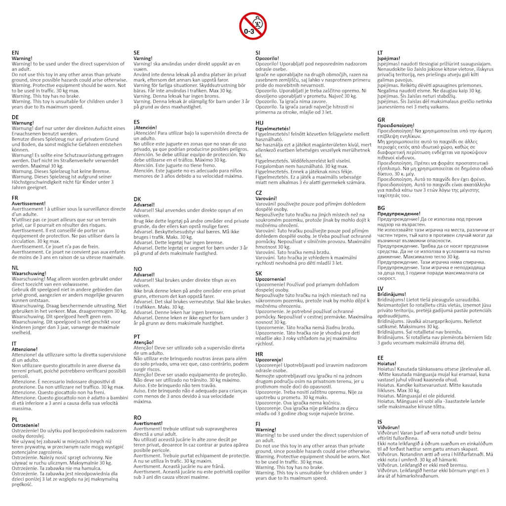 Opozorilo. Nositi je treba zaščitno opremo. Ni za uporabo v prometu. Ta igrača zaradi svoje največje hitrosti ni primerna za otroke, mlajše od 3 let.