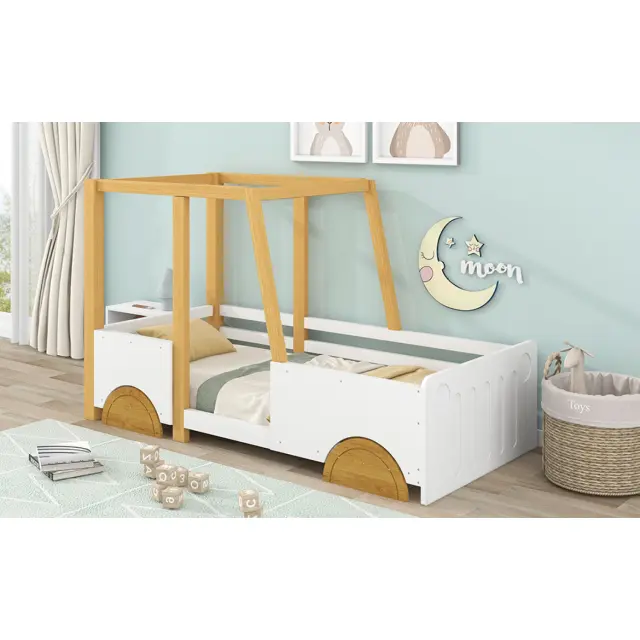 Autobett, otroška postelja z MDF kolesi, okvir iz bora, bela + naravna (90x200cm)