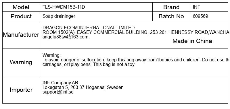 Opozorilo: Da bi se izognili nevarnosti zadušitve, vrečko hranite izven dosega dojenčkov in otrok. Vrečke ne uporabljajte v otroških posteljicah, vozičkih ali igralih. Ta vreča ni igrača.