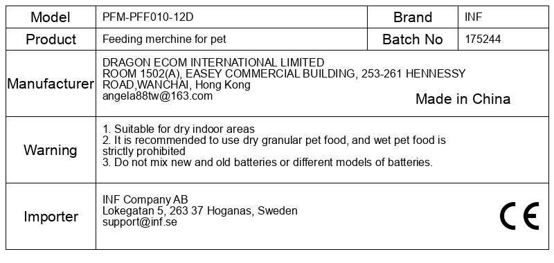 1. Primerno za suhe notranje prostore 2. Priporočljiva je uporaba suhe granulirane hrane za hišne ljubljenčke, mokra hrana za hišne živali pa je strogo prepovedana 3. Ne mešajte novih in starih baterij ali različnih modelov baterij.