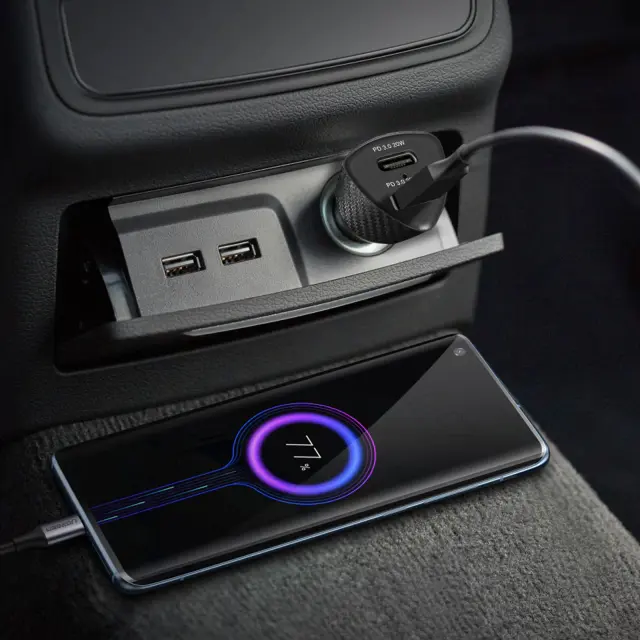 Kompakten avtomobilski polnilec Forcell 40 W z dvojnimi vrati USB-C vam omogoca polnjenje naprav, ko ste na poti. Tehnologija Power Delivery omogoca hitro in varno polnjenje. Eleganten je tudi s svojo karbonsko obdelavo.