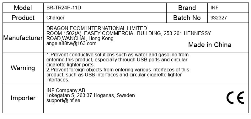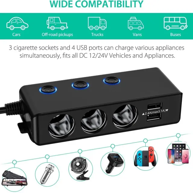 Univerzalna združljivost: ta avtomobilski polnilnik je zasnovan s širokim razponom napetosti od 12 do 24 V in je združljiv z večino vozil, vključno z avtomobili, tovornjaki in terenskimi vozili. Brezhibno se prilega vtičnici cigaretnega vžigalnika in zagotavlja zanesljivo napajanje vaših naprav na poti.