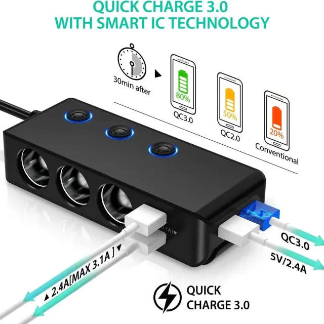 Hitro polnjenje: Ta avtomobilski polnilnik, opremljen s tehnologijo QC3.0, ponuja visoke hitrosti polnjenja za združljive naprave. Inteligentno identificira vašo napravo in zagotavlja optimalen polnilni tok, kar zagotavlja učinkovito in hitro polnjenje energije.