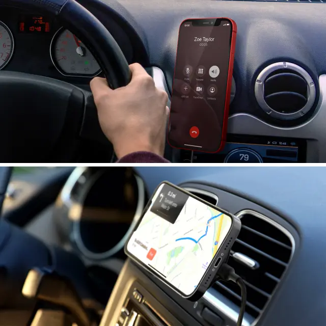 Avtopolnilec MagSafe znamke Belkin za polnjenje vašega iPhone-a, ko ste na poti. Zagotavlja do 10 W učinkovite moči polnjenja. Popolna zaščita pred električnimi sunki, prenapetostjo, prenapetostjo in kratkim stikom. Polnilnik s pritrdilnimi sponkami, ki se pritrdijo na zračnike.