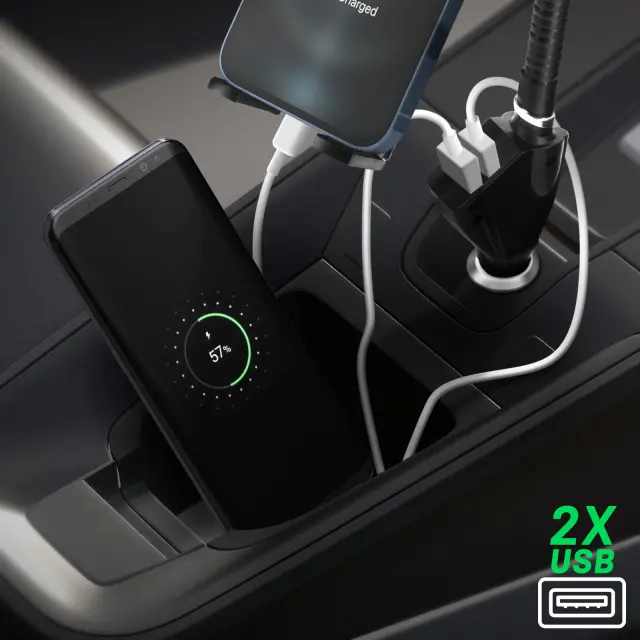 Vrtljivo avtomobilsko držalo za pametni telefon s gibljivo roko. 2x USB vhoda omogočata polnjenje vašega mobilnega telefona in dodatne naprave. Idealno za uporabo vašega mobilnega telefona kot GPS brez strahu pred izpadom baterije. Ustreza standardom CE, RoHS.