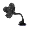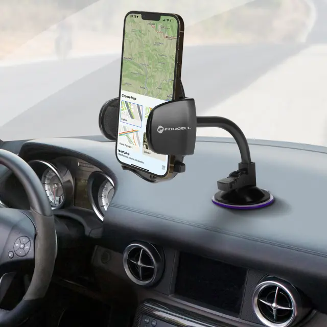 Crno avtomobilsko držalo za pametni telefon Forcell Ovale. Zahvaljujoc nastavku za prisesek se trdno pritrdi na armaturno plošco ali vetrobransko steklo. Ima sponko za obešanje na zracnik. 360° vrtljiva in 17 cm gibljiva roka.