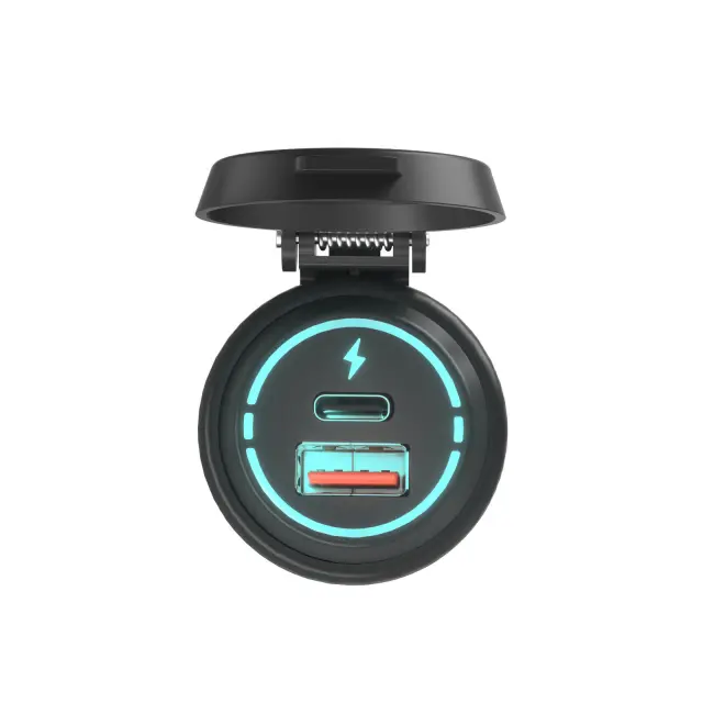Avtopolnilec z dvema izhodoma za polnjenje dveh naprav. Hitri polnilec ima tudi USB vhod s QC 3.0 in USB-C polnilni vhod, primeren za mobilne telefone, tablice in druge naprave.