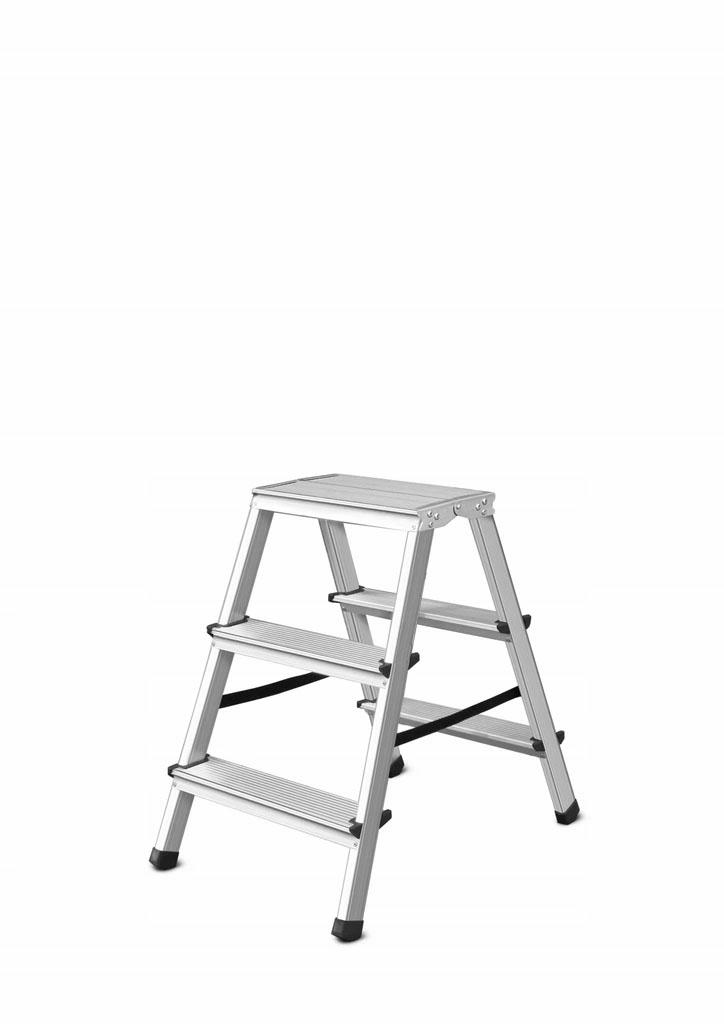 Lahka in trpežna domača lestev, narejena iz aluminija, stisnjena. se lahko razlikuje). široka delovna platforma. Ima najlonske trakove, da prepreči drsenje. transport in shranjevanje. Poljski izdelek.