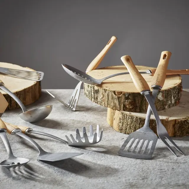 De Buyer perforirana kuhinjska lopatka iz brušenega nerjavečega jekla in ročaja, narejenega iz bukovega lesa, ki ga francoski proizvajalec pridobiva iz trajnostno upravljanih gozdov Vosges, je del linije "B BOIS" izdelkov, za katere je značilen robusten in brezčasen slog. Naravni materiali so dodatno zaščiteni s pastjo čebeljega voska. Lopatka je nepogrešljiv pripomoček v vaši kuhinji. Priporočamo ročno pranje.