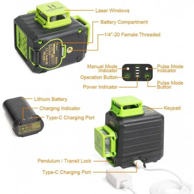 Delovna razdalja: 25m (300LUX), 50-60m z laserskim detektorjem Huepar LR-5RG / LR-6RG