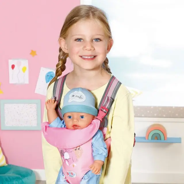 "Oh! Ah!..." BABY born kar ne more nehati kazati in brcati z nogicami. Toliko čudovitih živali je v živalskem parku. Sedi v svojem nosilnem sedežu, gleda naprej in občuduje koze, vidre, jelene in vse njihove kosmate prijatelje. Ko pa stopijo v jamo s netopirji, raje sedi obrnjena na drugo stran in se stisne k mamici ali očku. Temna votlina je vendarle malo strašljiva. Notranji del in pas okoli bokov nosilke krasijo prikupni potiski. Bruno medvedek na rožnatem zunanjem blagu izgleda prav tako sproščeno kot BABY born v notranjosti. Zahvaljujoč nastavljivim pasovom se lahko pri nošenju male lutke izmenjujeta mamica in očka. Lastnosti izdelka: Z zabavnimi grafičnimi okraski. Visokokakovostni dodatki za blagovno znamko lutk BABY born. Za bolj raznoliko in dolgotrajno igro. S pasnim sistemom, ki ustreza otrokom različnih velikosti. Primerno za lutke velikosti 36 cm in 43 cm. BABY born nosilka z nastavljivim sistemom pasov.
