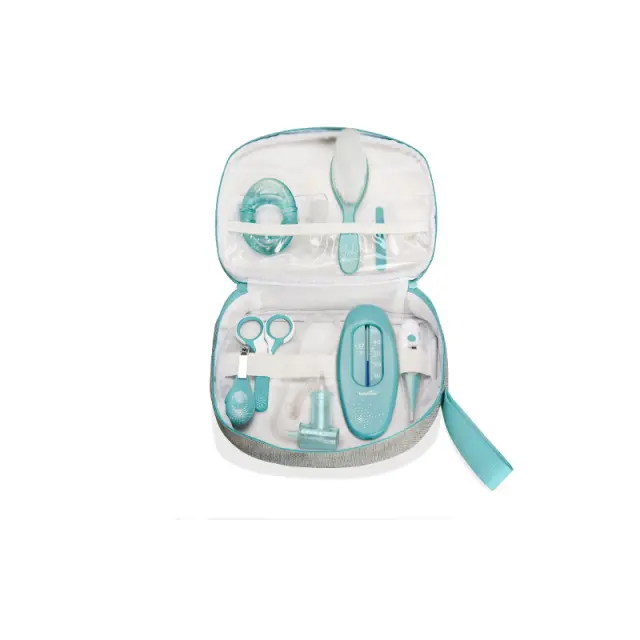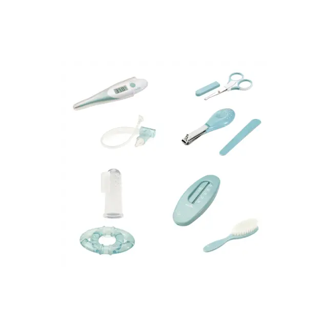 • 9 osnovnih pripomočkov za nego dojenčka: pilica za nohte, otroški nosni aspirator s sesanjem z ustnikom (sluz se zbira v zaprti komori), zobni obroček, krtačka za lase, zobna ščetka, kopalni termometer, rektalni termometer, nohti škarje in škarje z zaobljenimi konicami.