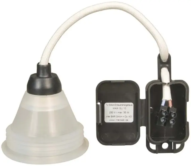 Primerno za zaščito pred strelo: neBachmann silikonsko ohišje 924. 350: več podrobnostiSilikonsko ohišje za vgradne reflektorje MAXI, barva: bela Interbär Series 1000, za visokonapetostne halogenske in LED sijalke, odporno na UV-žarke, ozon in staranje, za halogenske sijalke GU10 D: 51 mm, 230 V, največ 35 W ali LED sijalke GU10 230 V do 5 W, primerno samo za halogenske sijalke, ki oddajajo/oddajajo toploto spredaj! Ne uporabljajte svetlobnih virov COOL BEAM, Premer vgradnje: 68 mm, Globina vgradnje: približno 85 mm z vtičnico, Zunanje mere: D: 79 mm, Višina: približno 55 mm (brez vtičnice) EAN: 4016514085415