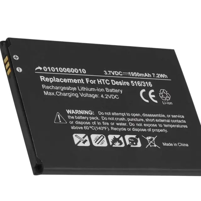 Ta baterija je neposredna zamenjava za referenčni številki 5360570 in B0PB5100, kar zagotavlja združljivost.. 3,7-voltna litij-ionska baterija z zmogljivostjo 1950 mAh, primerna za modela HTC Desire 516 in 316. Zanesljiva in vzdržljiva litij-ionska tehnologija z močjo 7,2 W za vsakodnevno uporabo. Odlično zasnovan za hitro in varno namestitev v pametne telefone HTC.