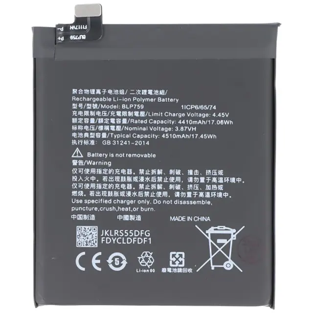 Baterija ima visoko zmogljivost 4510 mAh, ki omogoča celodnevno delovanje brez polnjenja.. Tehnologija Li-Polimer zagotavlja stabilno in varno polnjenje skozi čas. Model BLP759 zagotavlja popolno združljivost s telefonom OnePlus 8 Pro brez prilagajanja. Zamenjava daje napravi novo življenje z originalno zmogljivostjo..