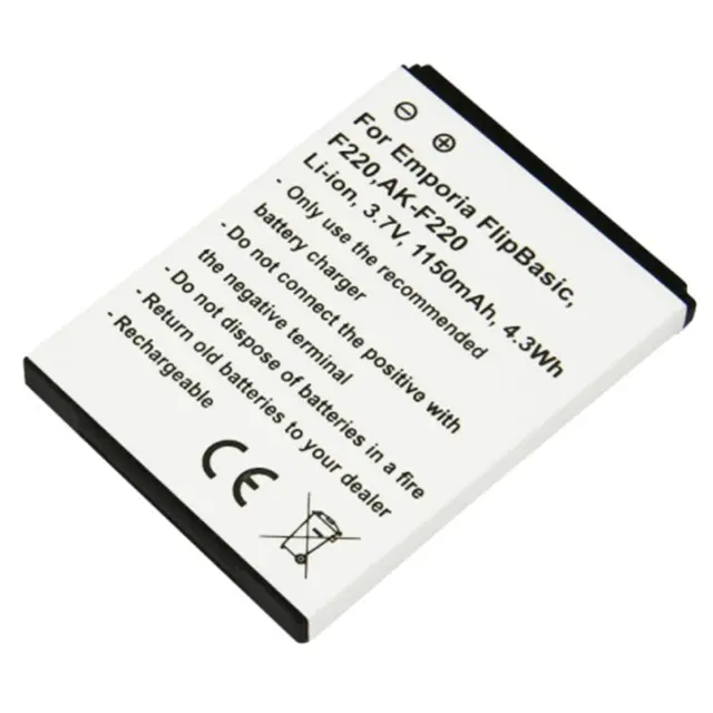 Združljiv z Emporia F220, FlipBasic in Tiptel Ergophone 6060. Nadomešča baterije AK-F220 in SD474050A. Nazivna napetost 3,7 V z zmogljivostjo 1150 mAh. Ploski format s stranskimi priključki, enakimi originalnim.