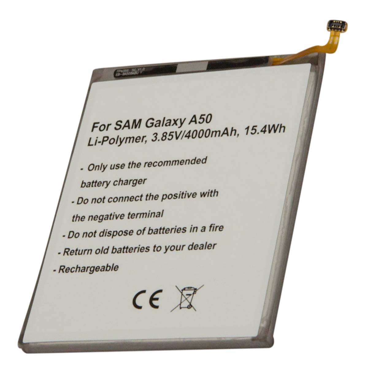 Baterija je združljiva s pametnimi telefoni Samsung Galaxy A30 / A50. Neposredna zamenjava za Samsungove tehnične reference EB-BA505ABN, EB-BA505ABU in GH82-19269A. Kapaciteta 4000 mAh, nazivna napetost 3,85 V, gostota energije 15,4 Wh. Ploščata li-polimerna celica z vgrajenim spajkanim fleksibilnim priključkom.