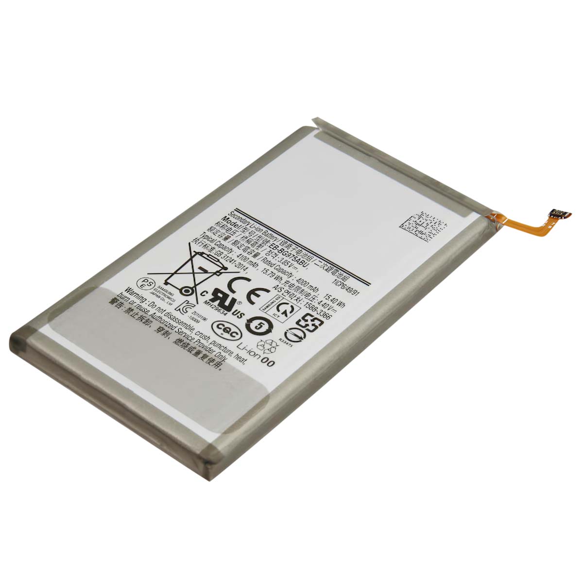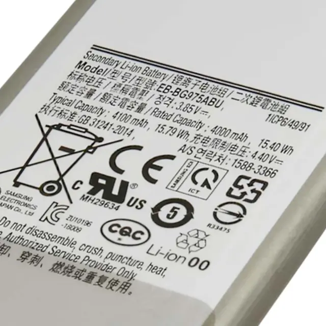 Baterija je združljiva s Samsung Galaxy S10 Plus, identifikator SM-G975F. Neposredna zamenjava originalne baterije Samsung EB-BG975ABU. Tipična zmogljivost 4100 mAh, nazivna napetost 3,85 V, energijska gostota 15,79 kWh. Ploščata li-polimerna celica z vgrajenim spajkanim fleksibilnim priključkom.