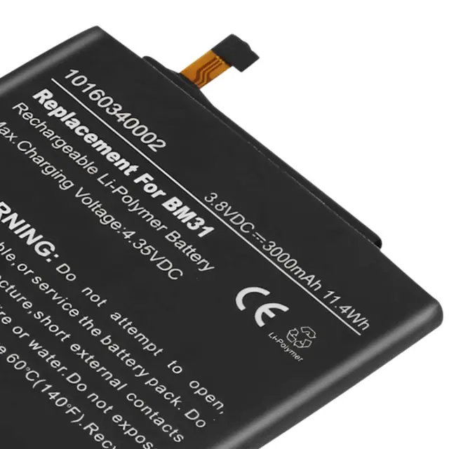 Baterija je združljiva s pametnimi telefoni Xiaomi Mi 3 in Mi 3s. Neposredna zamenjava originalne baterije Xiaomi BM31. Kapaciteta 3000 mAh, napetost 3,8 V, ekvivalentna energija 11,4 Wh. Ploščata li-polimerna celica z vgrajenim fleksibilnim priključkom.