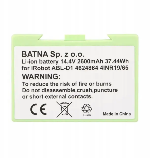 Podaljšajte avtonomijo vašega sesalnika Roomba z to litij-ionsko baterijo 14,4V in 2600mAh. Namenjena je zagotavljanju daljših ciklov čiščenja, kar izboljša učinkovitost vaših čiščenj, hkrati pa zagotavlja vzdržljivost in zanesljive zmogljivosti. Njene kompaktne dimenzije omogočajo enostavno integracijo, lahka teža pa olajša rokovanje. Enostavno jo zamenjajte za ohranjanje optimalne zmogljivosti in izberite ekološko rešitev za vsakodnevno čiščenje. Združljiva z modeli Roomba E5, E6 in i7.