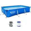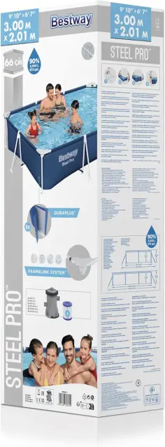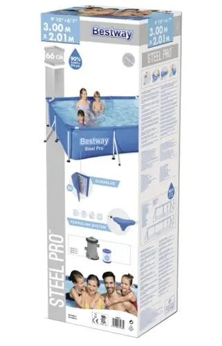 Opis: Dimenzija: d. 300 x š. 201 x v. 66 cm Barva: temno modra Oblika: pravokotna Z bazenom Steel Pro™ Frame Bazen set lahko vi in vaša družina uživate v hladni vodi na svojem vrtu. Bazen se hitro postavi in navduši s svojo vzdržljivo konstrukcijo. Priložena filtrirna črpalka ohranja vodo čudovito čisto. - Filtrirna črpalka z zamenljivim vložkom čisti vodo - Izjemno robustna 3-slojna PVC obloga za bazen DuraPlus™ - Jeklen okvir, odporen proti koroziji - Vgrajen odtočni ventil z adapterjem za vrtno cev - Priključek za morebiten filtrirni sistem (fi 32 mm) - Vključno s samolepilnim obližem za popravilo Tehnični podatki: - Blagovne znamka: Bestway - Oblika bazena: oglat - Vsebina vode pri 90% napolnitvi: 3.300 L - Globina vode pri 90% napolnjenosti: 59 cm - Material: 3-slojni PVC - Največji pretok: 1.060 l/h - Zmogljivost črpalke: 1.249 l/h - Priključek: fi 32 mm Teža: 16.81 kg