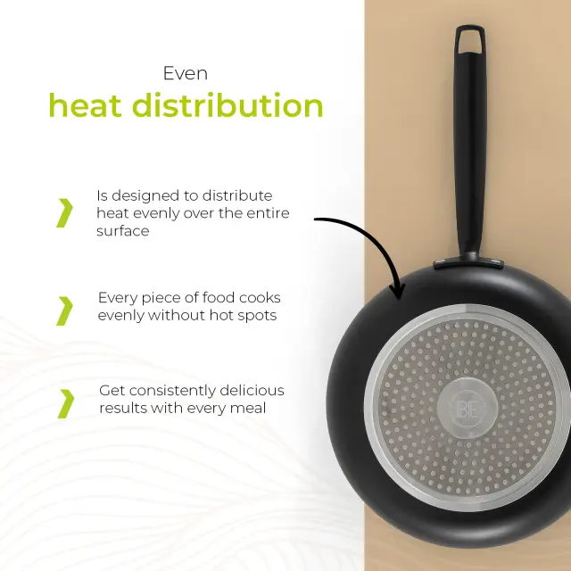 Ponev je zasnovana tako, da enakomerno porazdeli toploto po celotni površini. To pomeni, da se vsak kos hrane enakomerno skuha brez vročih točk, kar vam zagotavlja dosledno okusne rezultate pri vsakem obroku.