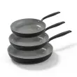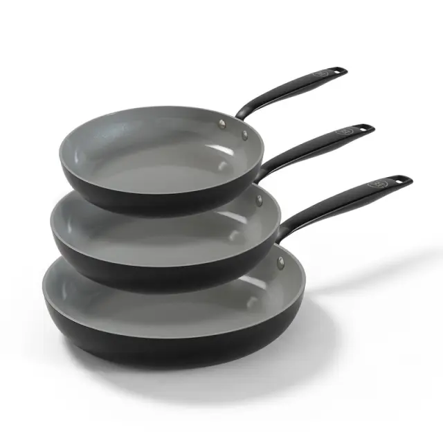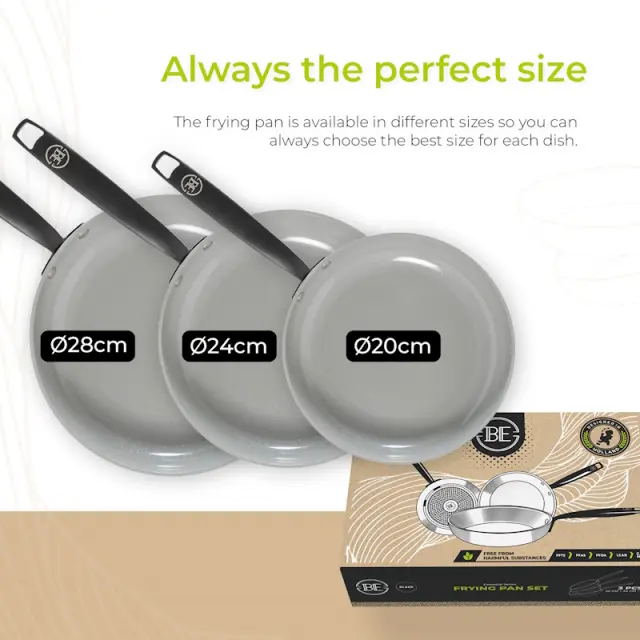 BE Living Set ponev Essential Black 20-24-28 cm, idealna za vse vire toplote, vključno z indukcijo, in ne vsebuje PFAS. Nepogrešljiv dodatek vsaki moderni kuhinji.