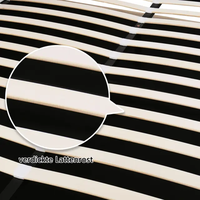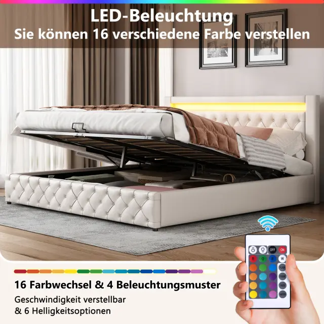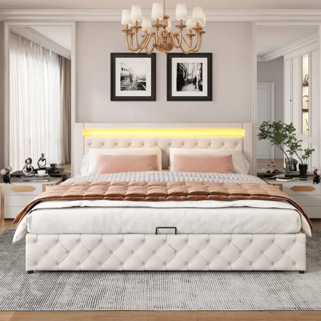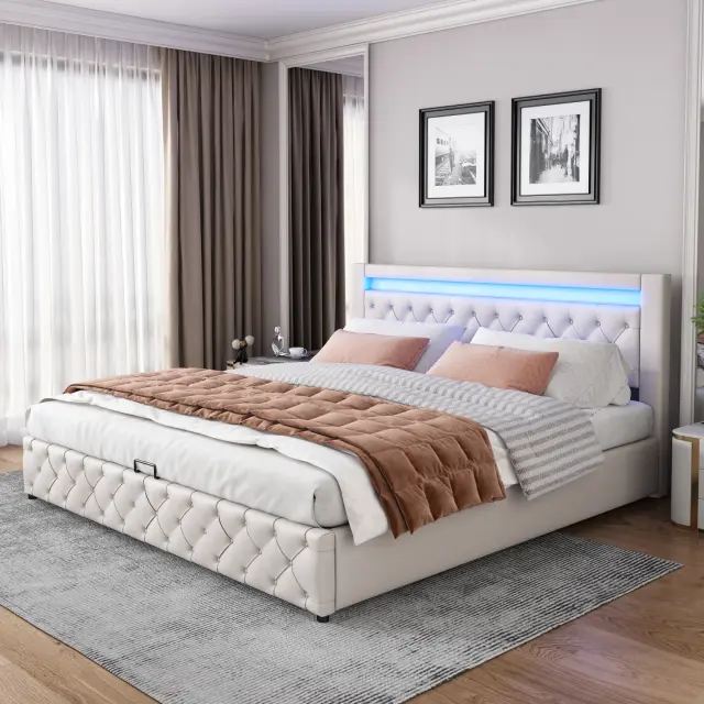 Bela oblazinjena postelja iz umetnega materiala 180x200 cm s shrambo, LED, letveni okvir