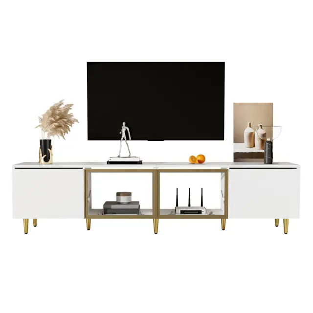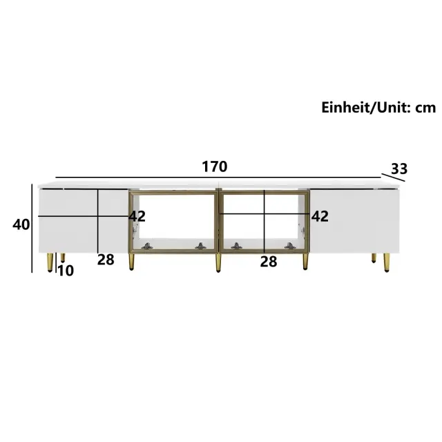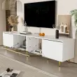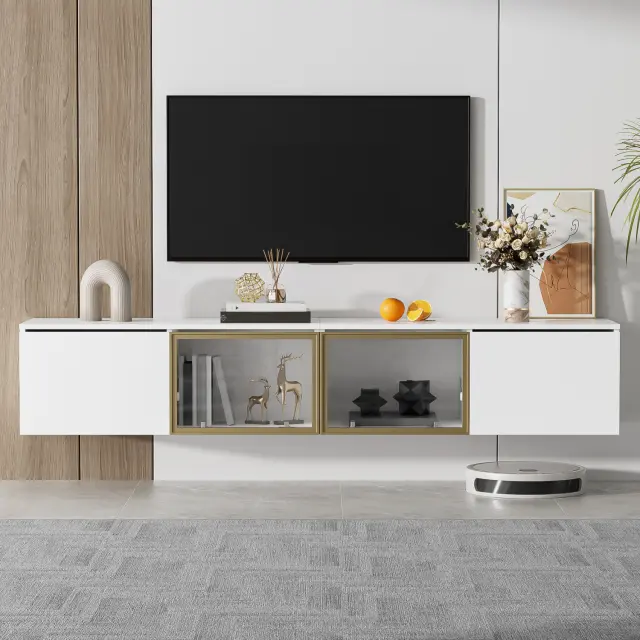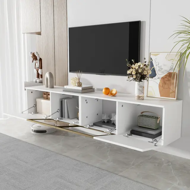 Bela TV omarica 170 cm, minimalistična, 4 vrata (2 stekleni), prostostoječa/montaža na steno