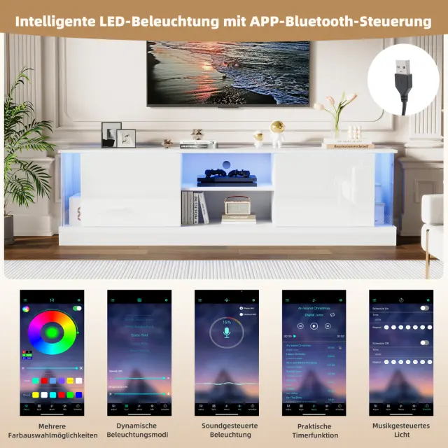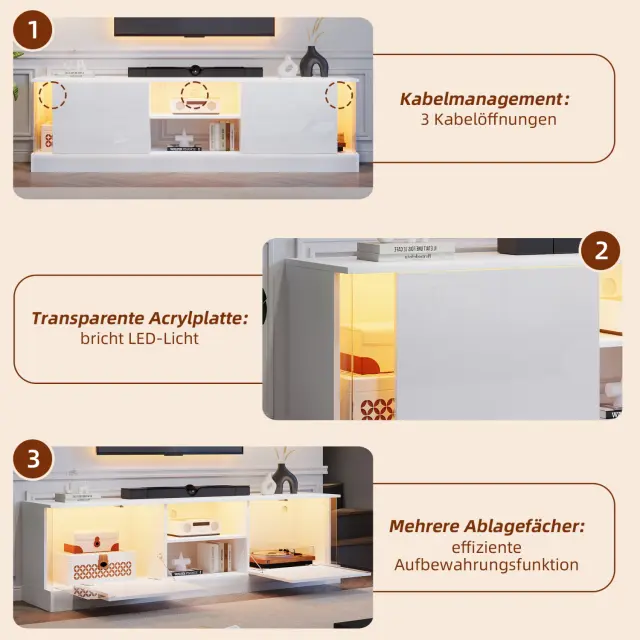 Bela visokosijajna TV omarica za televizorje do 70 palcev z LED osvetlitvijo