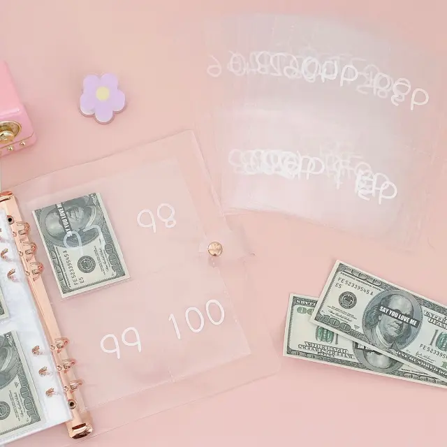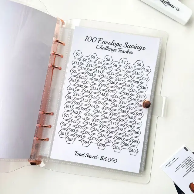 Komplet za varčevanje: Ta komplet vsebuje vse, kar potrebujete za začetek 100-dnevnega izziva ovojnic: beležko A5, 25 potiskanih ovojnic za denar in kartico za prebijanje za spremljanje napredka.