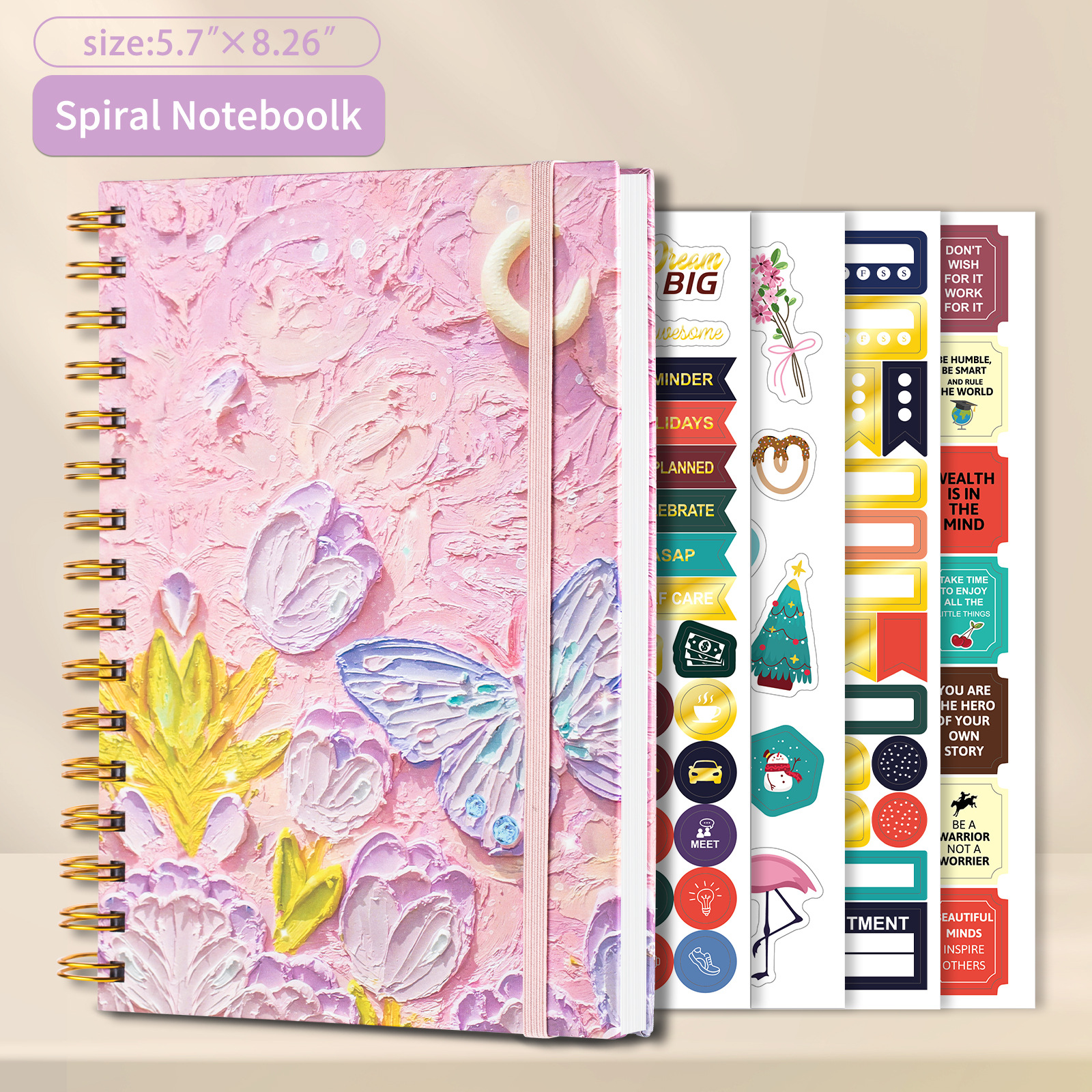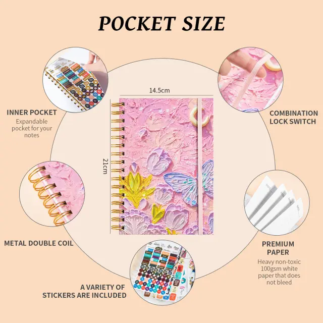 Vsestranski in organiziran: Ta beležnica je kot nalašč za različne namene, od vodenja dnevnika in beleženja do skiciranja in načrtovanja. Priložene nalepke za načrtovanje iz zlate folije dodajo pridih elegance in vam pomagajo ostati organizirani. Uporabite jih za označevanje pomembnih datumov, opravil ali idej.