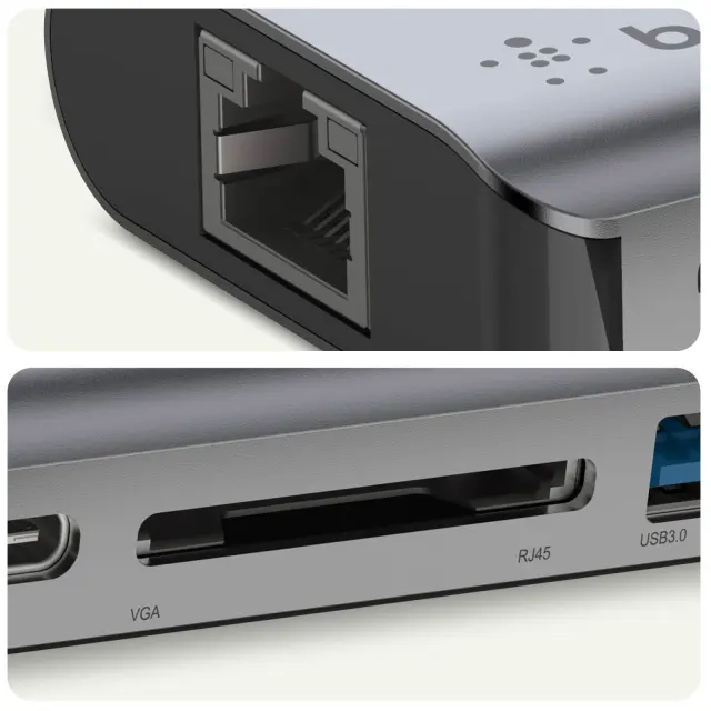 Belkinovo večportno vozlišče USB tipa C za razširitev zmogljivosti prenosnika ali tabličnega računalnika. Izhod HDMI do 4K (3.840 x 2.160 px pri 30 Hz) za širokozaslonsko predvajanje na monitorju, projektorju ali drugem zaslonu. 2 vhoda USB 3.0 za priključitev tipkovnice, ključa USB, miške in prenos podatkov s hitrostjo 5 Gbit/s. Vhod USB-C Power Delivery omogoča hitro napajanje do 100 W.