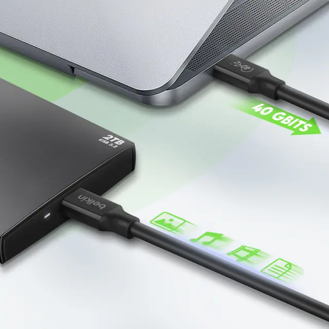 Belkinov črni polnilni kabel s 100 W moči za naprave, ki so najbolj požrešne z energijo, kot so prenosni računalniki.. Tehnologija Power Delivery za izjemno hitro polnjenje združljivih naprav: pametnih telefonov, tabličnih računalnikov, iPadov itd.. Inovativni kabel USB4 za hiter prenos podatkov do 40 Gbit/s. Certifikat USB-IF za varno in zanesljivo povezljivost, ki ustreza varnostnim standardom.