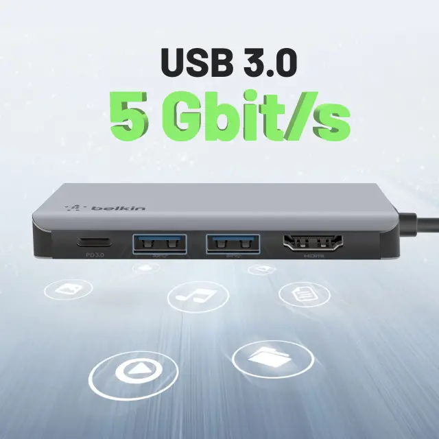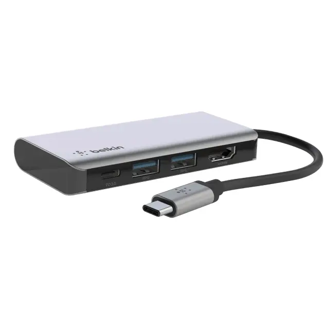 Belkinovo večportno vozlišče USB tipa C za razširjen delovni prostor. Izhod HDMI do 4K (3.840 x 2.160 px pri 30 Hz) za širokozaslonsko predvajanje na monitorju, projektorju ali drugem zaslonu. 2 vhoda USB 3.0 za priključitev tipkovnice, ključa USB, miške in prenos podatkov s hitrostjo 5 Gbit/s. Vrata USB-C Power Delivery za hitro napajanje do 100 W.