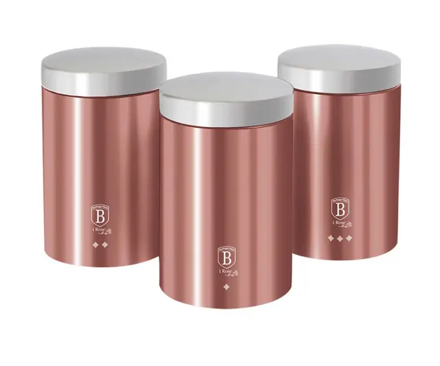 Sklop 3 posode za shranjevanje razsutih izdelkov, kot so kava, čaj, sladkor. Posode iz linije iRose znamke Berlinger Haus.Izdelano iz kovinsko lakiranega jekla.